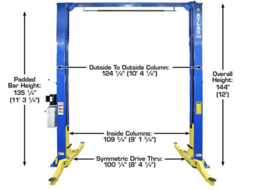133 7/8″ (11′ 1 7/8″) (Without Power Unit)Outside Column To Outside Column 124 1/8″ (10′ 4 1/8″) Lift Height