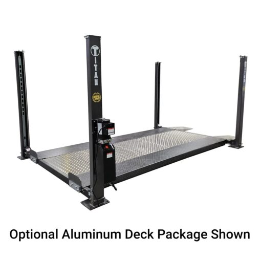 The Titan Master Series 4-post parking / storage lifts are an ideal choice for automotive enthusiasts needing extra garage space for a car, boat, lawn equipment, etc. The 110-volt motor allows for easy adaptation into a garage or workshop in any residential application. Easy operation lock release handle located by the power unit will minimize bending or squatting during operation. The internal linkage rods are sleek and hidden, while still accessible for adjustments if needed. This feature makes the Master Series a perfect lift for the individual who may work on their vehicle while on the lift. Includes aluminum ramp kit, caster kit, (3) drip trays, tool tray, and (2) wheel stop plates.
